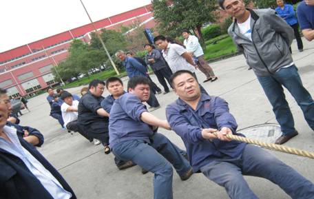 环保新材料队,综合管理部联队共八支拔河队伍,下午1:00员工准时集合,在综管部的主持下,先按照男女7:3的比例进行抽签分组,分组后各组组长再抽签决定各自的对手;比赛采取三局两胜制,每组优胜者晋级下一轮比赛。从比赛一开始各队都气势如虹,蓄势待发,企图在气势上先压倒对手。各参赛小组均表现出对此次比赛的必胜信心和高度的激情与团结。加油声此起彼伏,喧嚣振耳,大家都卯足了劲,寸土必争!战况是激烈、紧张而残酷;胜者,欢欣鼓舞,败者,扬言誓要再度杀回,一决胜负。